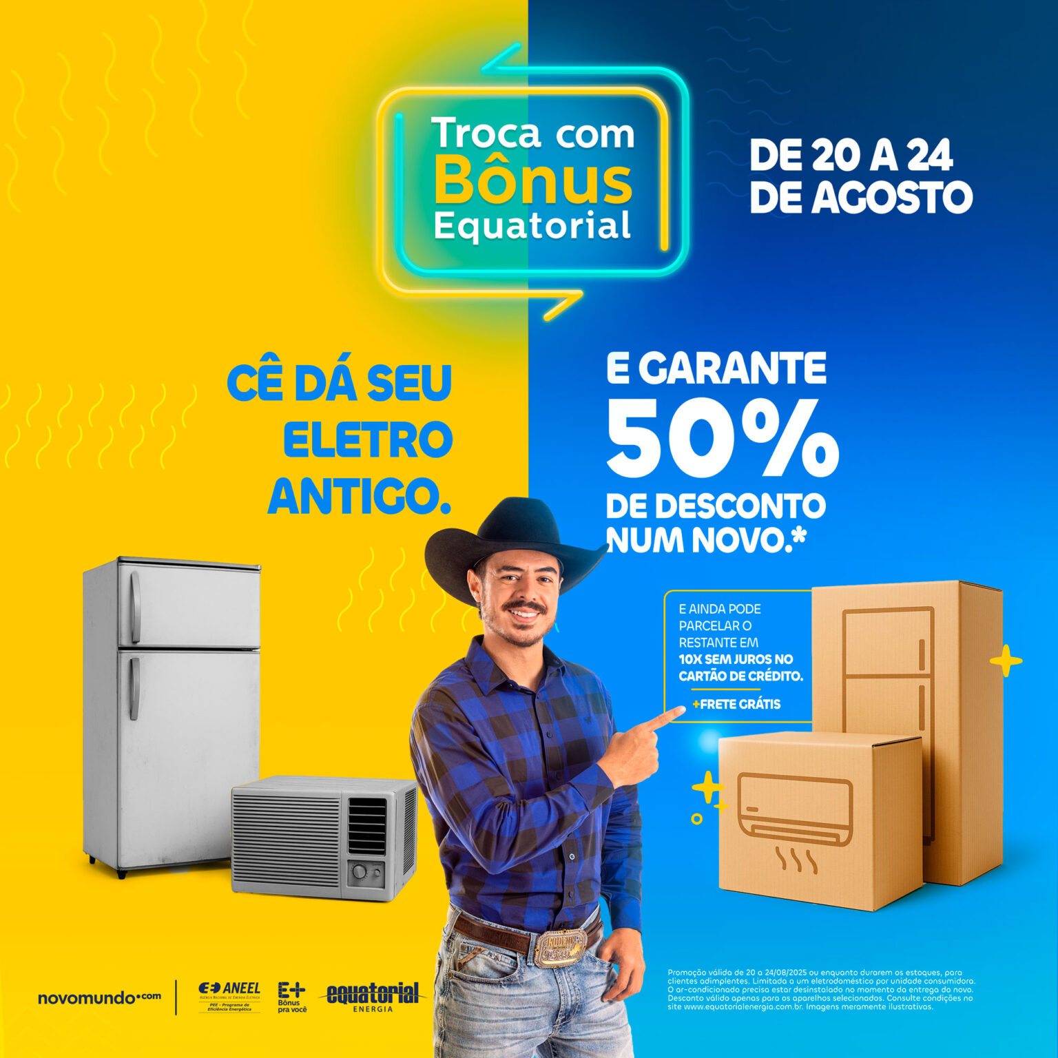 O valor do novo produto será reduzido pela metade, e o pagamento pode ser feito em até 10 vezes sem juros. A entrega do novo eletrodoméstico e a retirada do antigo serão realizadas pela loja parceira Novomundo, em até 7 dias úteis após a compra.
