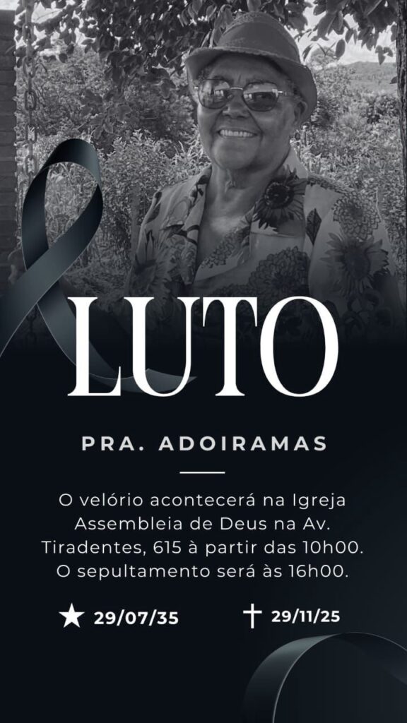 É com profundo pesar que comunicamos o falecimento da Pra. Adoiramas, carinhosamente conhecida como Dona Dora. Ela partiu no dia 29 de novembro de 2025, aos 90 anos, deixando saudades eternas em todos que tiveram o privilégio de conhecê-la.
