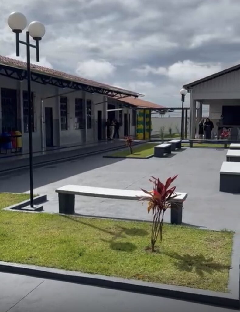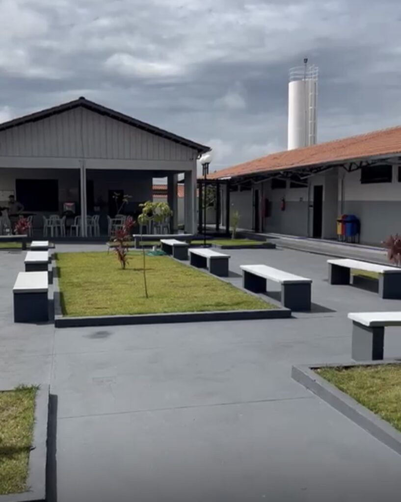 O novo prédio escolar oferece uma infraestrutura moderna e completa, com sete salas de aula distribuídas em três blocos, biblioteca, laboratórios de ciências e informática, refeitório com cozinha, bloco administrativo, além de uma quadra poliesportiva coberta com vestiário e sanitários. O espaço conta ainda com pátio em concreto, garantindo conforto e segurança para os alunos. No total, são 2.166,31 m² de área construída, projetados para atender melhor à comunidade escolar.