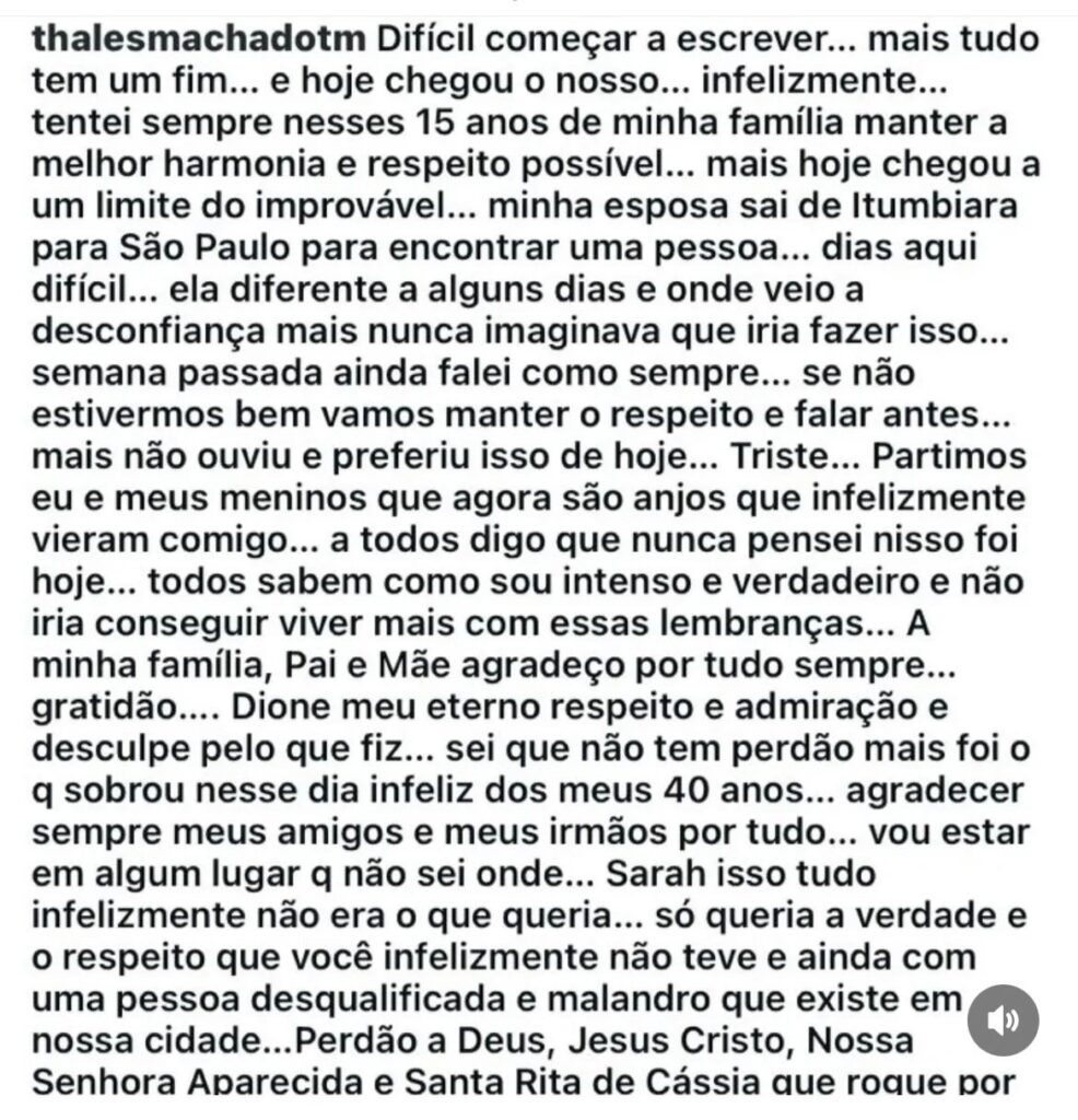 De acordo com as primeiras informações, a mensagem reunia relatos de dificuldades conjugais, citações a uma suposta infidelidade, pedidos de desculpas dirigidos a familiares e amigos, além de referências de cunho religioso. No documento, Thales declarou estar emocionalmente fragilizado e afirmou ter alcançado o que descreveu como o “limite do improvável”.