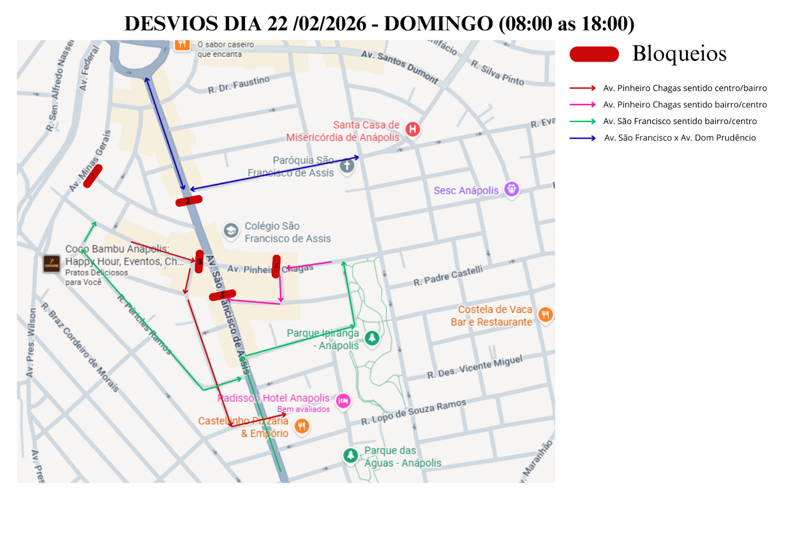 O penúltimo ponto de atenção para o motorista é a Avenida Pinheiro Chagas, em frente ao Colégio São Francisco. Por fim, a Avenida São Francisco também sofrerá com as obras no cruzamento com a Av. Pinheiro Chagas, sendo interditada entre a Rua Benedito Borges de Almeida e a Av. Pinheiro Chagas.