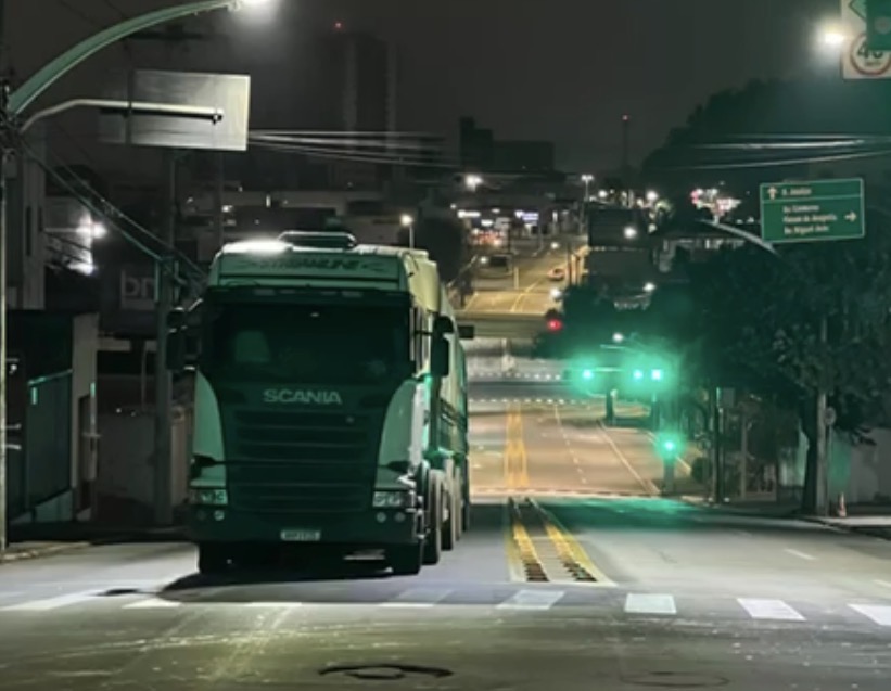 Uma carreta bitrem apresentou pane mecânica e está parada desde a madrugada na subida, na Avenida Goiás em frente ao Colégio Estadual Prof. Faustino.