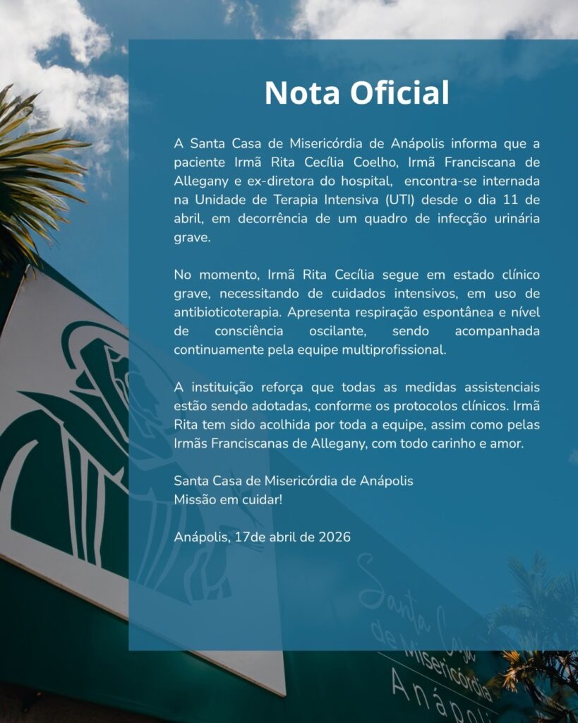 A Santa Casa de Misericórdia de Anápolis informou nesta sexta-feira (17) que a paciente Irmã Rita Cecília Coelho, religiosa das Irmãs Franciscanas de Allegany e ex-diretora da unidade, está internada na Unidade de Terapia Intensiva (UTI) desde o último dia 11 de abril, após ser diagnosticada com um quadro grave de infecção urinária.
